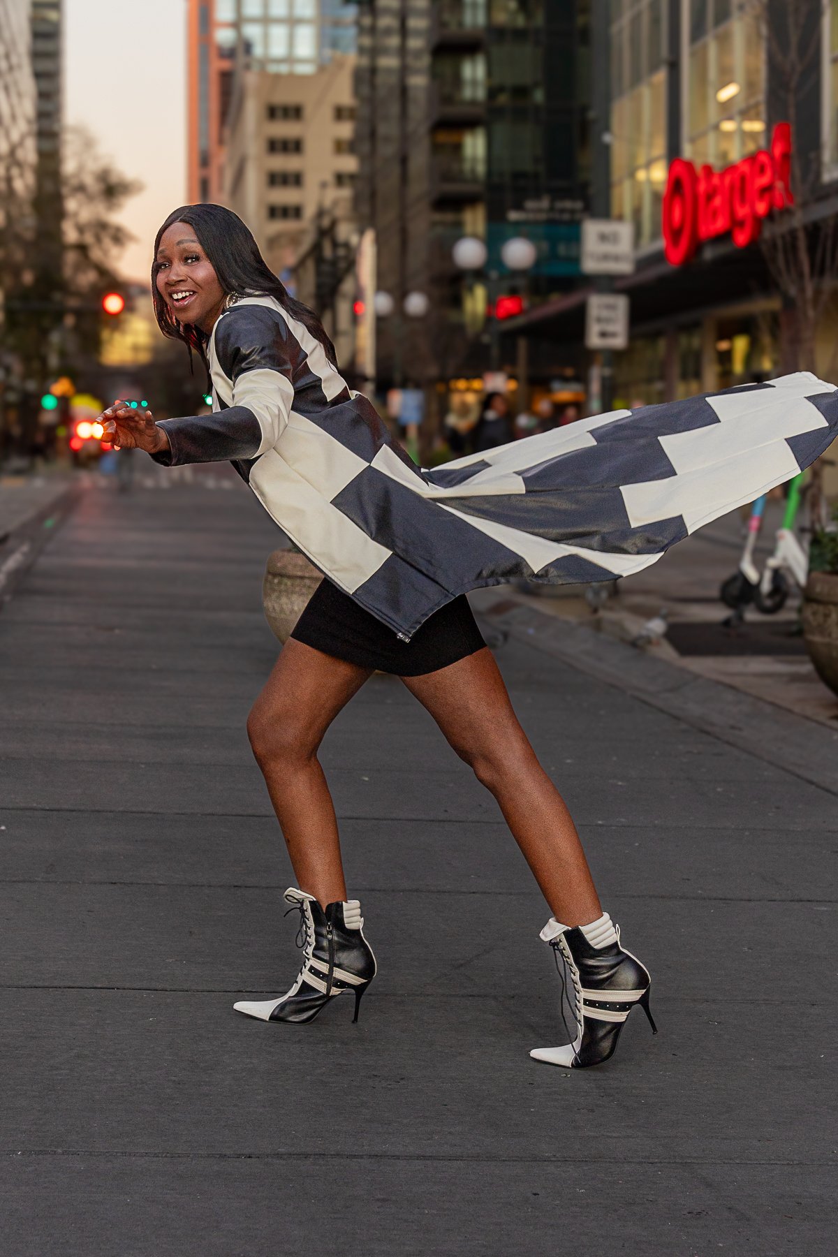 Female model walking to a new location in Seattle